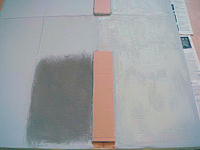 Kuvassa vasemmalla suoraan hiekalla tehty pinta ja oikealla hiekka sekoitettuna maaliin, josta tuli oikeastaan betonipinta. Työskentelyä vaikeutti yllättävästi se, että hiekan väri vaihtui melkoisesti valaistuksen mukaan ja oli selvästi tummempi hehkulampun valossa. Valitettavasti hienot halkeamat jäivät viimeistelyssä hiekan alle, vaikka pintaan tuli muuten mukavasti kulumaa.