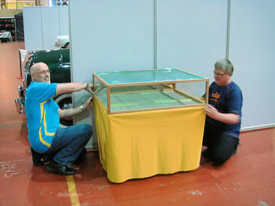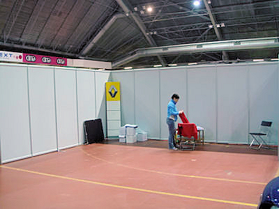 Osaston takaseinälle piti vielä keksiä jotain, sillä vaikka tarjolla olisi ollut sama banderolli kuin viime vuonna, niin nyt se ei oikein sopinut kokonaisuuteen. Onneksi Jarmo oli kysellyt lipun teettämistä kerholle ja vaikka aikataulu taisi olla valmistajalle hieman tiukka, niin se kuitenkin saatiin ajoissa. Itseasiassa isoin työ taisi olla kerhon logon piirtäminen uudelleen vektorigrafiikkana, jotta kuvasta tuli selkeä isossa koossa. Tarjolla olleista pikkukuvista olisi suurentamalla saanut vain suttua. Seuraavissa kuvissa näkyy, miten kerhon osasto muodostui. | |