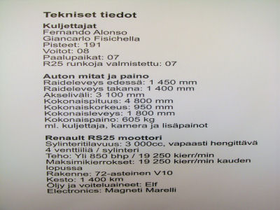 Renaultin R25 mallista löytyy varsin kattava selostus. Ylemmän kuvan auto ei ole R27 vaikka onkin maalattu tämän vuoden väreihin.