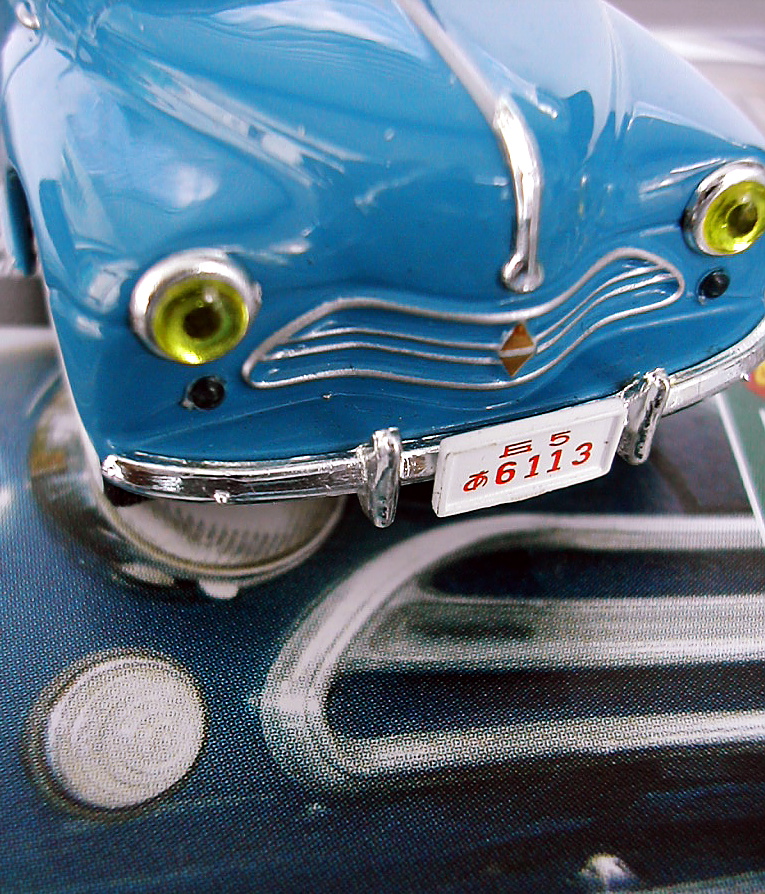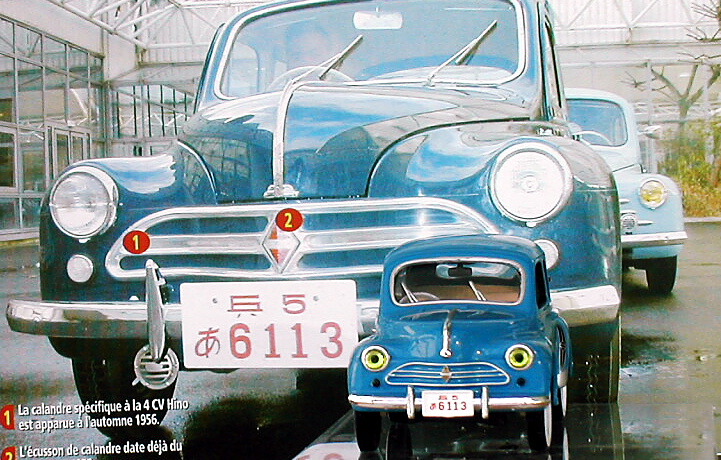 Mallin esikuvana toimii Japanissa lisenssillä valmistettu Renault 4CV, jota Hino valmisti kymmenen vuoden ajan alkaen 1954. Kokonaistuotanto ylsi 50 000 autoon, alkutaipaleella malli lienee ollut suora Renaultin kopio, mutta vuonna 1956 Hino muutti joitakin yksityiskohtia ja alkoi samalla käyttää Japanilaisia osia, josta johtuen Renault menetti rojaltinsa. Ovelat japsit kun löysivät lainsäädännöstään tällaisen pykälän. Kuukauden autona on nimenomaan uudempi, VM- 1957 4CV Hino, jossa nuo korimuutokset ovat jo hyvin näkyvillä, tosin kaikkia eroja ei mallintekijä ole tähänkään laittanut. Lähdeaineiston mukaan uudemmassa Hinossa oli mm. suuremmat puskurit ja takaikkuna. Kojelauta ja sisustus poikkesivat Ranskan mallista hieman ylellisemmällä varustuksellaan ja myös maski sai oman ilmeensä. Hino 4CV:n maski on päädyistään kiinni muodostaen maskiin eräänlaisen kehikon, kun taas Renaultissa maski koostui poikittaisrivoista, joiden määrä vaihteli eri vuosimalleissa. | |