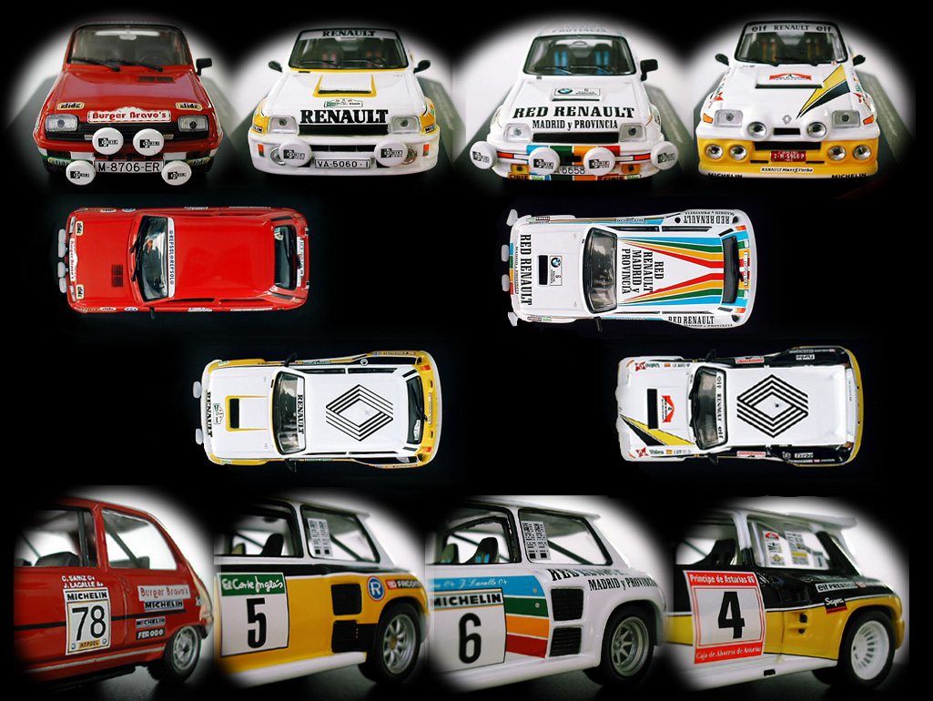 Tässä esittelyssä ovat mukana R5 TL, 5 Turbo, Turbo 2 sekä Maxi Turbo, kaikkien ahdettujen autojen ollessa B-ryhmän keskimoottorimalleja. Turbo 2-mallilla Sainz ajoi kaksi kautta ja autoissa ei ole suurta eroa keskenään, siksi vain toinen pääsi mukaan. Se toinen puuttuva auto on etuvetoinen 5 Turbo, Sainz ajoi Espanjan R5 Turbo Cup-ratasarjaa ja malli on ihan hieno, mutta raja oli vedettävä ralliautoihin. Puuttuvista malleista on mukana ainoastaan yksi kuva kummastakin ja keltainen Renaultin logo kuvien kulmissa erottaa ne näistä jutun autoista.
