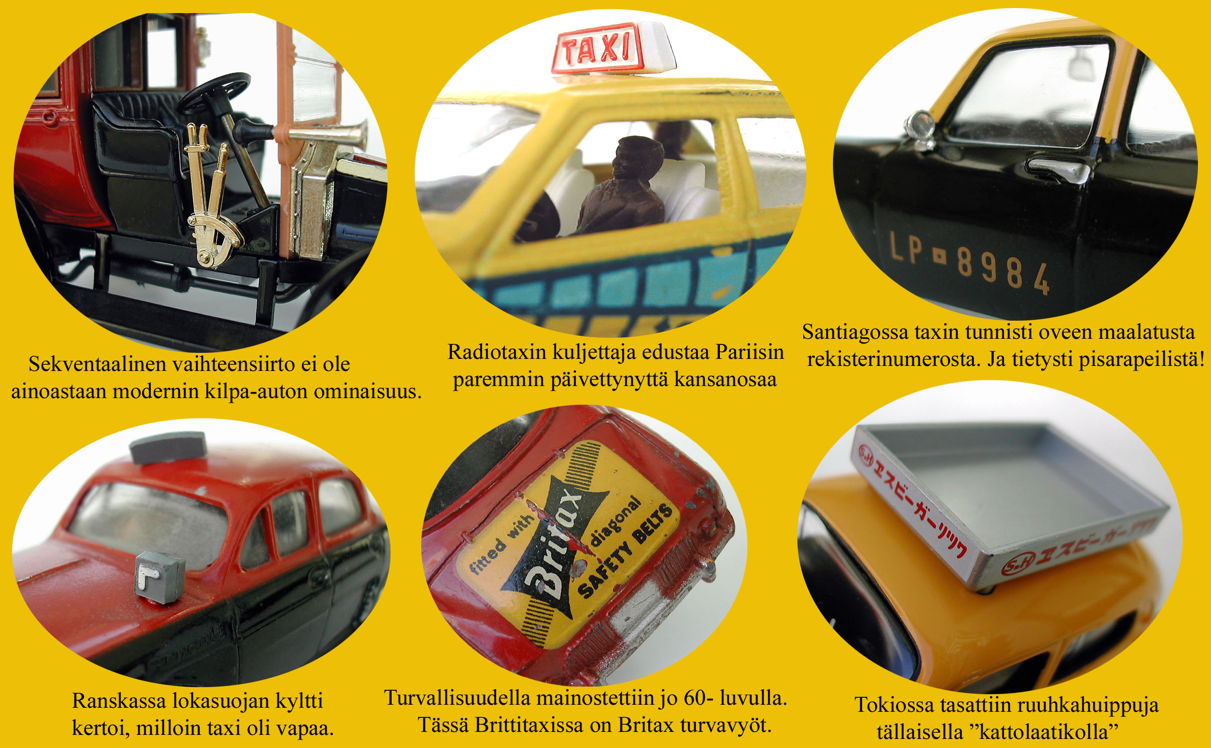 Autojen esittely kulkee numeroitujen kuvien muodossa, mutta ne eivät ole missään paremmuus- tai aikajärjestyksessä. Esikuvan / mallin tyyppimerkki, kotipaikka sekä vuosi, jolloin auto on ollut taksina, löytyy tekstistä. Neljää mallia lukuun ottamatta kaikki muut kuuluvat kioskiautoihin. Tällä kertaa ne ovat osa Altayan julkaisemaa maailman taxit-sarjaa, jossa on kaikenmerkkisiä taksiautoja ja tähän on poimittu sarjan Renault-taksit. Altaya teettää kaikki autonsa IXO:lla ja aina välillä käy niin, ettei kustantaja halua teettää ja maksaa uutta muottia, vaan se käyttää jo olemassa olevaa, mutta hiukan väärän vuosimallin autoa. Taxisarjan mallien alustaan on aina merkitty kotipaikka sekä vuosiluku, jolloin auto on ollut taksikäytössä. Mistä nuo vuosiluvut sitten ovat peräisin ja pitävätkö ne ihan tarkkaan kutinsa, on toinen juttu. Olen käyttänyt suoraan tuota rasian antamaa tietoa, sillä näiden autojen historiaa ei ole mitenkään liiaksi asti tarjolla.
