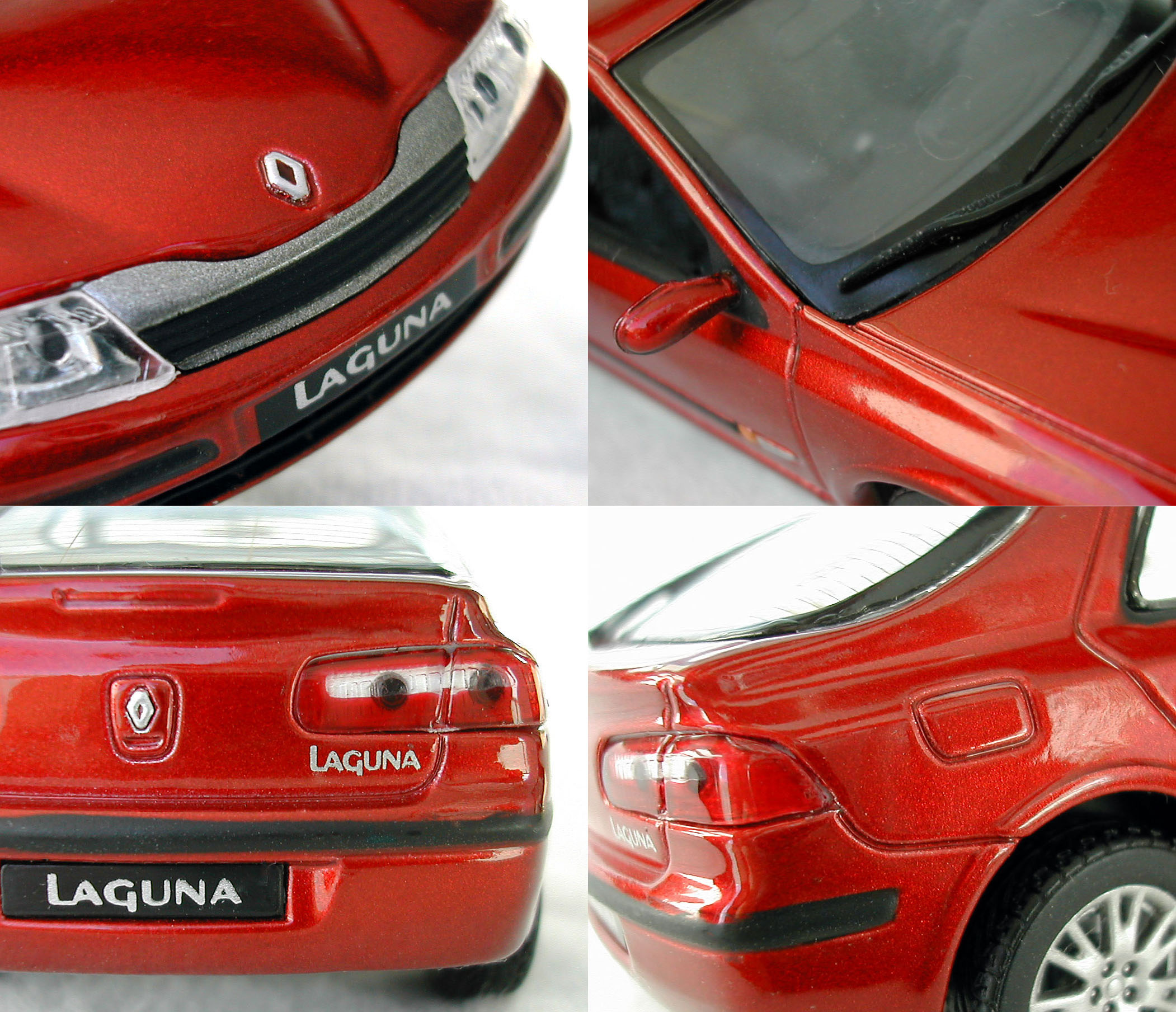 Tämänkertaisen esittelymallin valintaan vaikuttivat paitsi punainen väri, myös muutamat muut kriteerit, joista eräänä oli auton ikä. Se ei saanut olla vanha, jo museoiän saavuttanut harrasteauto, mutta ei myöskään uutuusmalli, joten kymmenenvuotias Laguna tuntui sopivalta valinnalta. Lisäksi pienoismallin tuli olla laadukas ja esittelynsä ansainnut tuote, sellainen auto, josta olisi tehty ilman muuta esittely jo uutena, mikäli pienoismallisivu olisi ollut jo olemassa. Tästä autosta on ollut kuva jo aiemmin myös kerholehdessä vuonna 2006, jolloin Kari Kitti on esitellyt Lagunan pienoismalleja laajemminkin. Tämä versio valikoitui nyt tarkempaan esittelyyn, sillä kaksijäseninen raatimme (jonka päätöksistä ei voi valittaa) äänesti tuloksella kaksi- nolla, että juuri tämä korimalli on kaunein koskaan tehty Laguna. Aina joskus huomaan, tosin vasta pitkän ajan kuluttua, toistaneeni itseni taas oikein urakalla. Näin kävi myös viime kuussa, kun jaarittelen kaikkea yleistä Dacian filosofiasta, muistamatta lainkaan että olin tehnyt Loganin perusmallista mallijutun jo ajat sitten ja käynyt siinä läpi samat jutut. Pahoittelut siis etukäteen, sillä näin tulee varmasti käymään myös tulevaisuudessa, niin kauan kuin näitä tarinoita kirjoitan. En minä muista, mitä malleja olen esitellyt, hyvä jos muistan käydä kaupassa… Laguna 2
