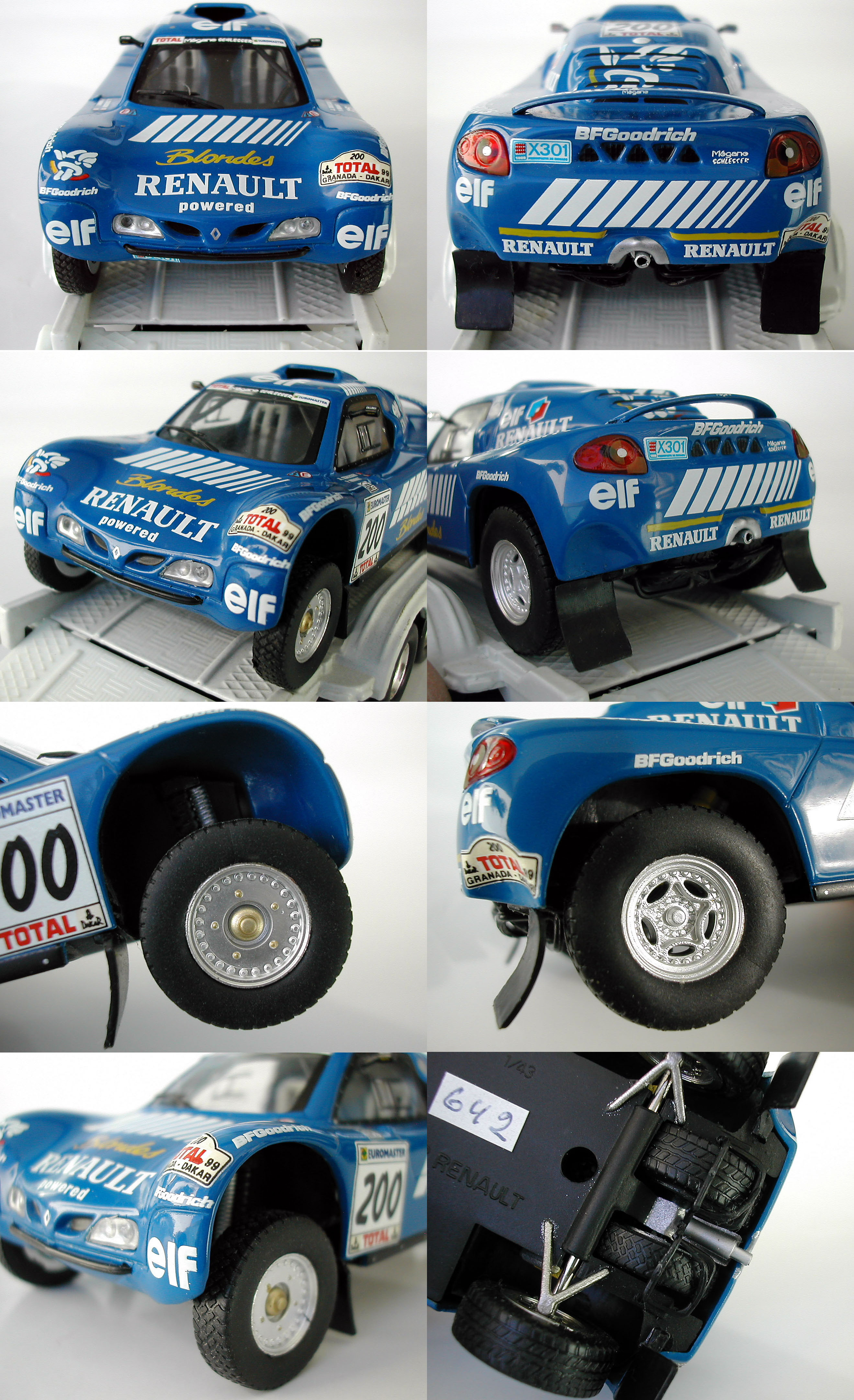 Tästä mallista ei taida olla kioskiautoa, mutta JLS voitti Dakarin myös seuraavana vuonna ja siitä autosta on jostain syystä montakin versiota liikkeellä. Tuo vuoden 2000 Megane ei juurikaan eroa koriltaan tästä versiosta, mutta siitä tehdyt pienoismallit eroavatkin sitten toisistaan todella paljon. IXO on tehnyt siitäkin tällaisen vastaavan mallin, valikoimista löytyy lisäksi tiimin toisen kuskin, Servian auto ja kolmas vaihtoehto on tietenkin kioskiauto, joskaan se ei ole pikkuosiltaan ihan yhtä tarkka kuin viralliset IXO-mallit. Norev on myös tehnyt kolme eri mallia, ilmeisesti ainakin yksi on taas kioskimalli, mutta sitähän nettihuutokauppiaat eivät mielellään kerro, Norev kun kuulostaa kalliimmalta. Yksi niistä on puhdas ja kiiltävä perusmalli, kahden ollessa valmiiksi "likaisia" eli kyljet ovat saaneet kunnon kuraefektit. Noreveissa on outoa se, että teippaus ja kuran määrä poikkeavat keskenäänkin toisistaan, en tiedä miksi, enkä lähtenyt asiaa sen enempää penkomaan. Se on kokonaan eri juttu, mutta sellaisiakin siis on saatavana, mikäli joku nyt alkaa metsästää itselleen tällaista mallia. | |