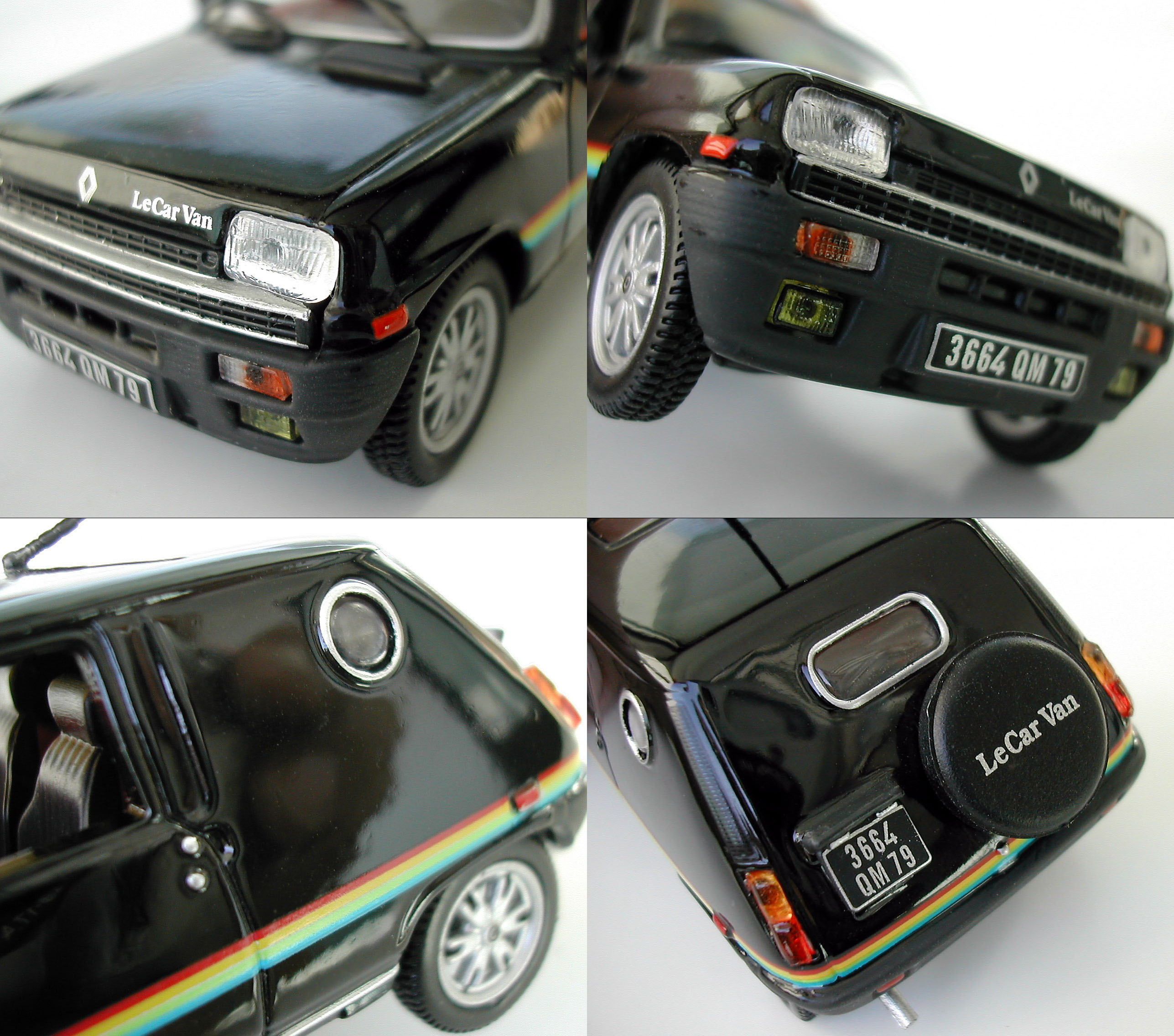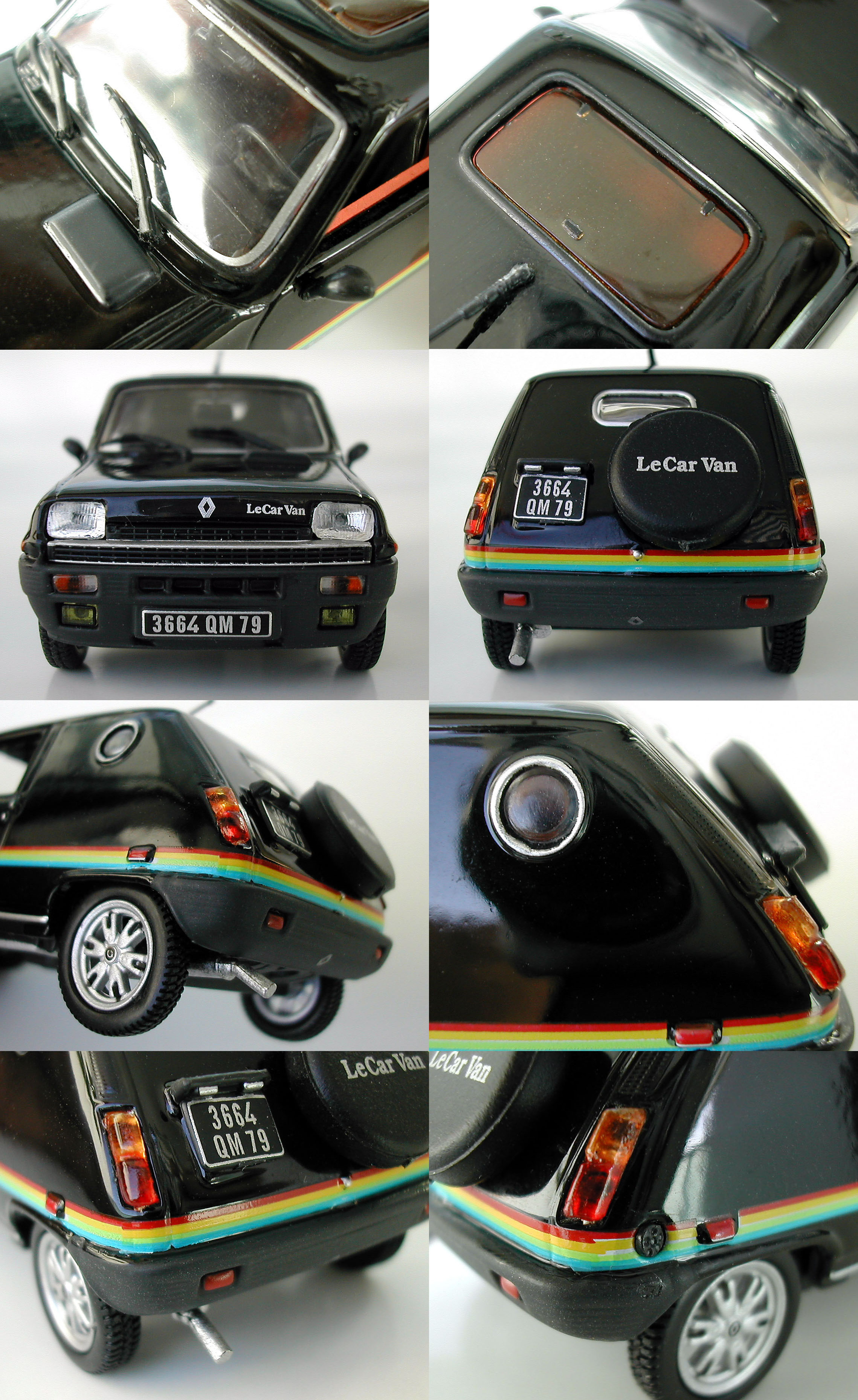 Takakulmien korkeat ritilät, luukun aukaisunuppi sekä puskuriin upotetut punaiset valot ovat kaikki metallivalua ja viimeistelty maalilla. Erilliset muovivalot olisivat toki paremmat, mutta näillekin on sentään valettu omat paikkansa, samoin puskuriin on valettu noita pitkiä uria ja ne erottuvatkin aika hyvin tuon satiinimaalin ansiosta. Keskellä takapuskuria on Renaultin tarra, mutta se on niin alhaalla, ettei sitä meinaa oikein huomata ja alhaalla on myös takapönttö sekä putken ulostulo. Tässä mallissa on kokopitkä putki, kun löytämissäni peruspakettiautojen kuvissa taas näkyi lyhyempi, takapyörän eteen loppuva putki. Vielä kun tuo putki olisi ontto tuosta päästä, niin siinä olisi saatu helpolla ja halvalla sellaista kalliimman mallin tyyliä. On täysin makuasia tykkääkö tuollaisista jenkkityylin takaikkunoista ja varapyöräkoteloista, mutta ainakaan kukaan ei voi moittia auton takapäätä tylsäksi tai tavanomaiseksi.