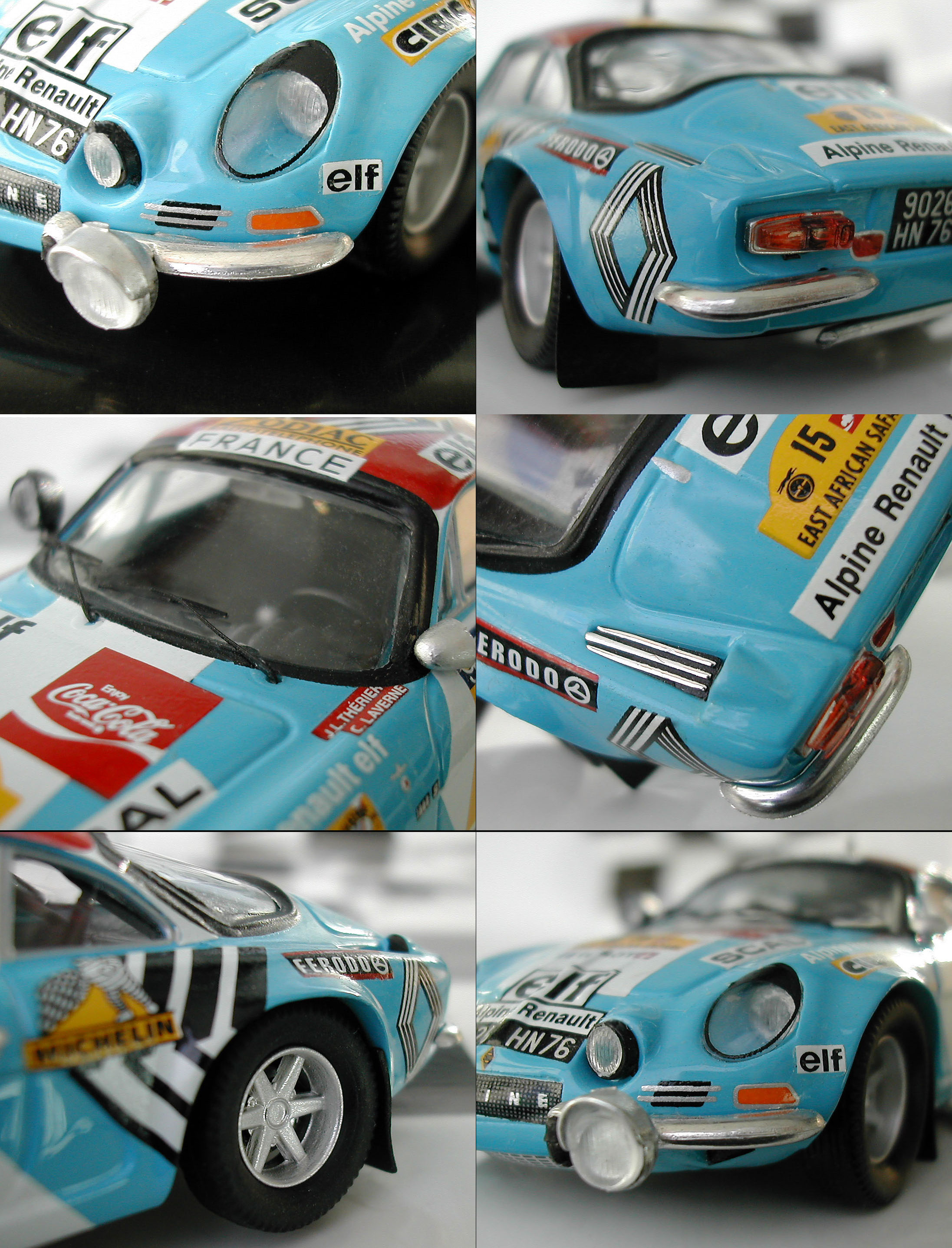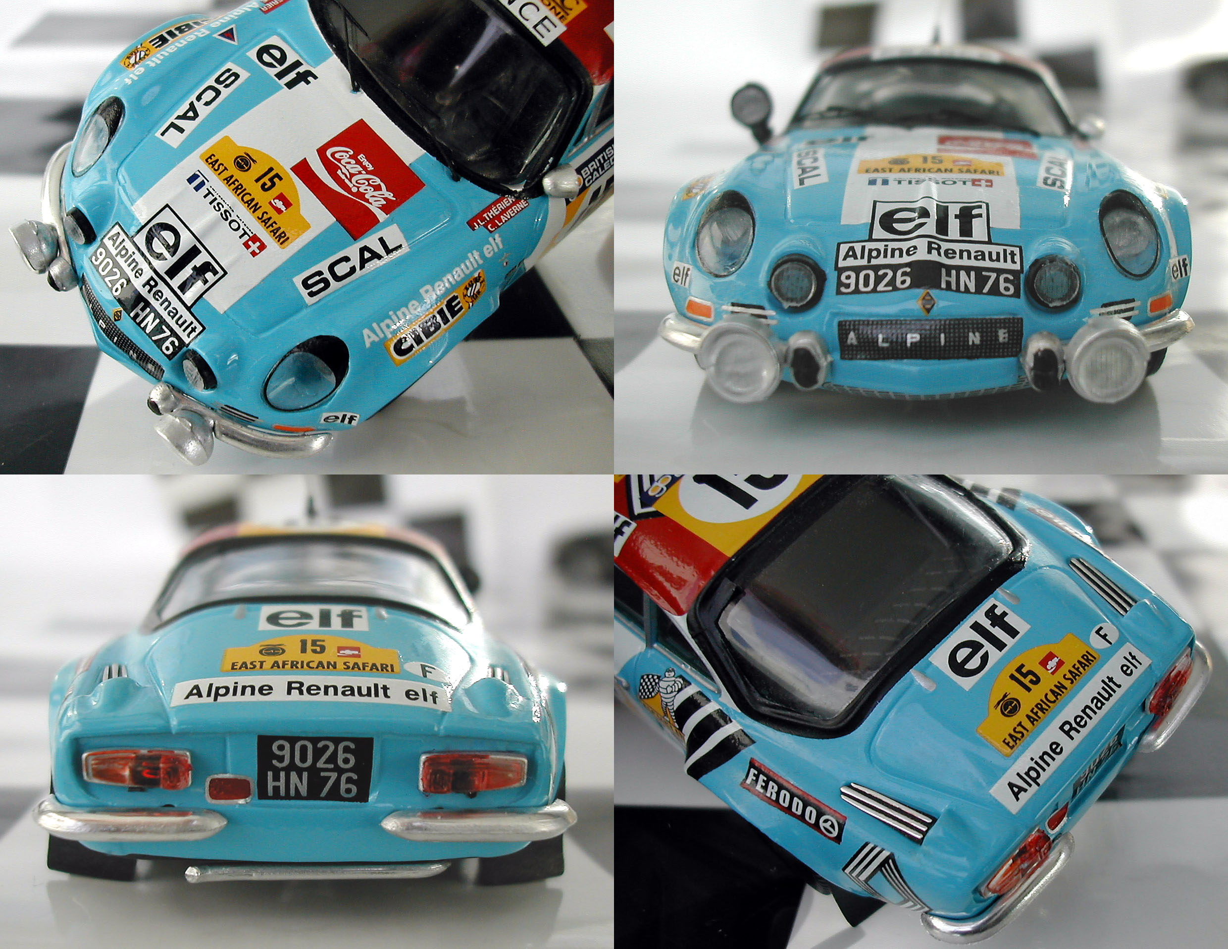 Nyt esittelyssä oleva pienoismalli on siis alkujaan Safarirallin malli vuodelta 1974, kuskina oli Jean-Luc Thériér, toista tehtaan Alpinea ajoi Bernard Darniche ja autot oli luokiteltu ryhmään neljä. Kilpailussa oli mukana myös yksi R16 ja kaksi 17 Gordinia, mutta kaikkien kohtaloksi koitui keskeytys tekniseen vikaan. Tästä kuvien autosta mureni jousitus ja pyöräntuennat, toisessa Alpinessa oli samoja ongelmia ja lopullisesti auto halvaantui konerikkoon. Moottorit korkkasivat myös kolmessa muussa Renaultissa ja nyt jälkeen, kun on nähnyt paljon kuvia sekä joitain vanhoja filmejä tuon ajan safariralleista, en ihmettele noita ongelmia lainkaan. Alpine on jo lähtökohtaisesti liian kevytrakenteinen tuollaiseen kilpailuun ja tuntuu käsittämättömältä, että sillä ylipäätään lähdettiin Safariin.