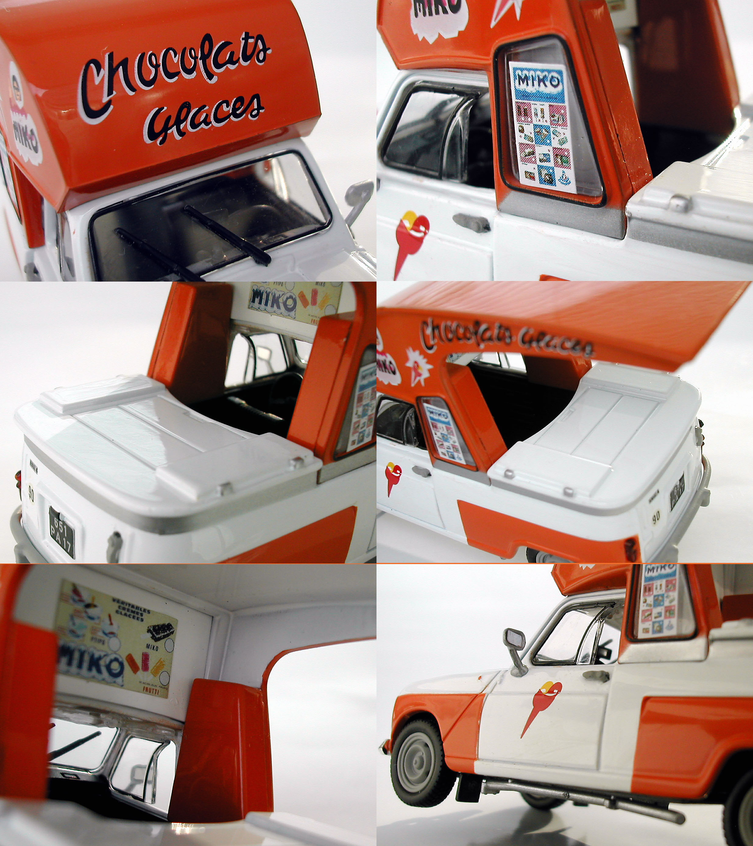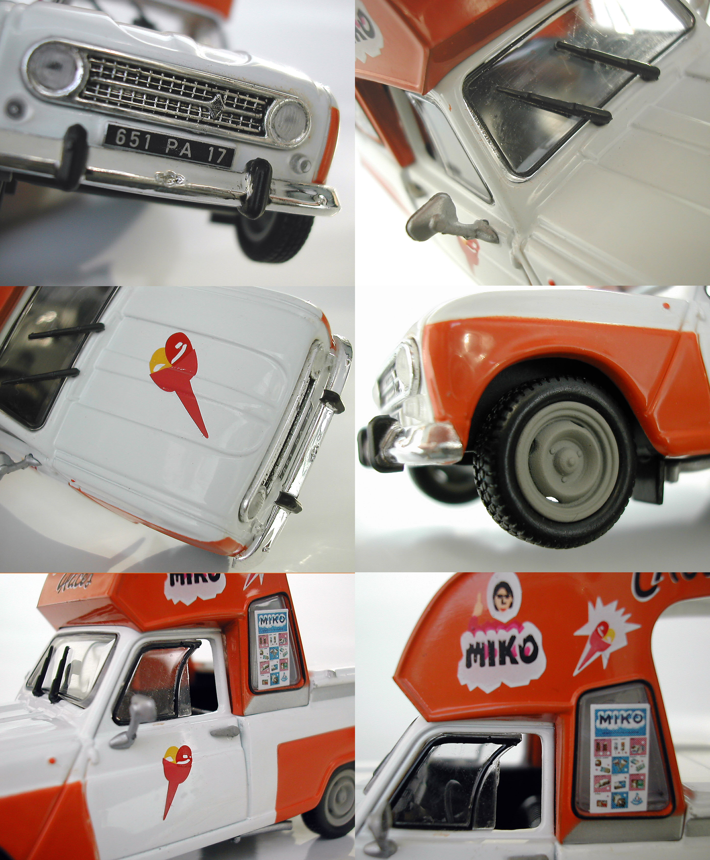 Itse kanta-autokin on ihan hyvin mallinnettu, vaikka se jää usein hiukan sivuseikaksi tällaisissa erikoismalleissa. Autossa on paljon erillisiä pisteosia kuten maski, kaikki valot, pyyhkijät, ovien- ja takaluukun kahvat, tankin korkki sekä kunnolliset rahtimallin taustapeilit. Kuskin puolen helmassa on erillinen pakoputki ja edessä on jopa muoviset roiskeläpät. Puskurit ovat esikuvan tapaan keskenään eri paria, vanteetkin on ihan oikein mallinnettu ja renkaissa on karkea, vanhaa hakkapeliittaa muistuttava pintakuvio. Sivulasien liukusysteemeihin on selvästi paneuduttu ja ne ovatkin näkyvästi esillä. Koska jäätelökauppa käy parhaiten lämpimällä ilmalla, ikkunat ovat tietenkin auki. Ensin näyttää kuin tässä olisi rekkatermin mukaan ns. makuuhytti, mutta taaemmat sivulasit ovat vain jäätelökuvastoja varten. Niistä sekä kioskipuolen seinätaulusta on saanut valita, mitä lajia haluaa ostaa.