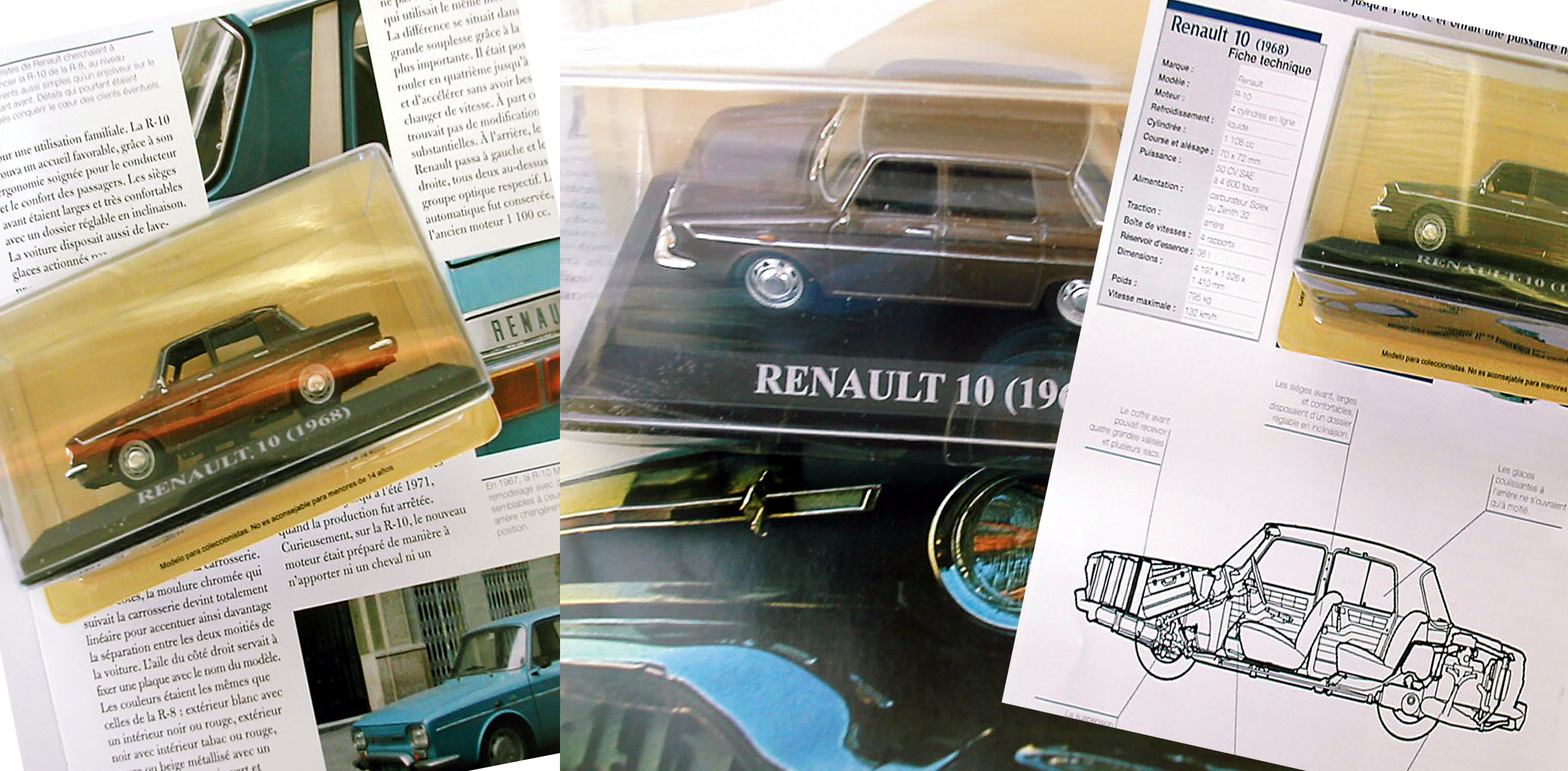 Tähän loppuun vielä vanha kuva, jossa näkyy R5 - malliin kuuluneen lehden yksi aukeama sekä pari kuvaa erittäin nätistä mallista tyyppiä R10 ja nimenomaan ruskeana. Tämä yksilö vietiin ns. käsistä, rasiaa ei avattu lainakaan, joten autosta ei ole erillistä valokuvaa. Muutama myyntikuva sentään löytyi ja kuten näkyy, malliin alkujaan kuuluva lehti on erittäin hieno lisä, silloin kun sen onnistuu saamaan. Suurin osa myynnissä olevista "kympeistä" on joko espanjan poliisiautoja tai sinisiä siviilimalleja. Tätä ruskeaakin löytyy vielä, mutta liian harvoin ns. sopuhintaan.