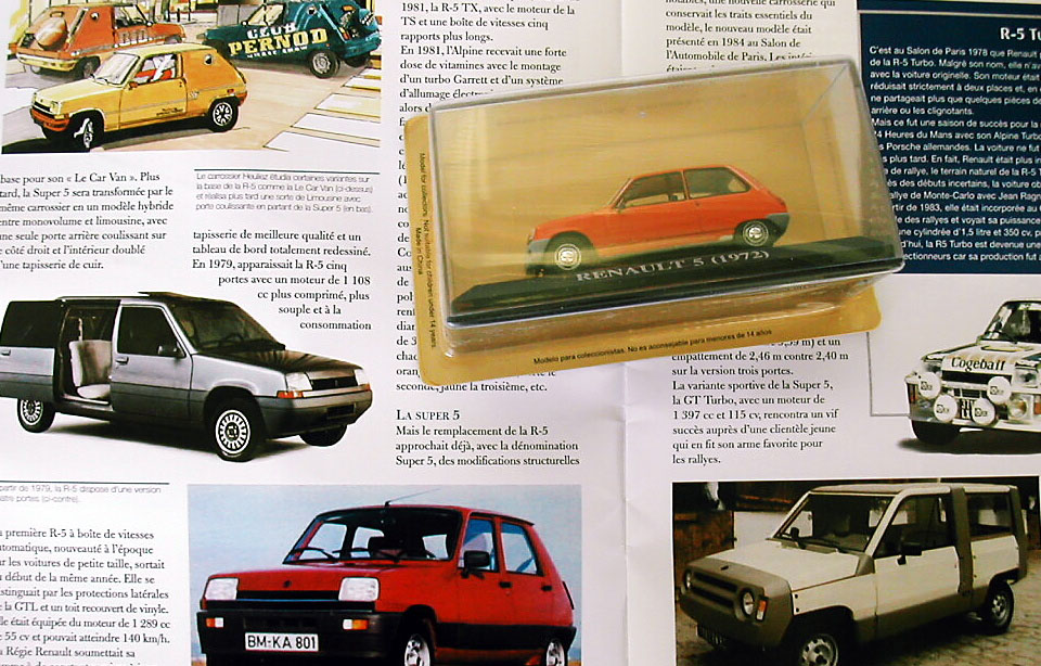 1. Altaya-kioskiauto Renault R5, erittäin nätti, klassinen perusmalli ja juuri siinä oikeassa suomiauton värissä. Alkujaan edullinen ja silti erittäin hyvä malli tällaista tarvitsevalle. Kaikki oleellinen on saatu mukaan ovien kahvoja ja raitatikattua kojelautaa myöten. Esikuvahan on tämän päivän Suomessa jo nähtävyys, eikä tätä pienoismalliakaan enää kukaan tyrkytä ruuhkaksi asti.