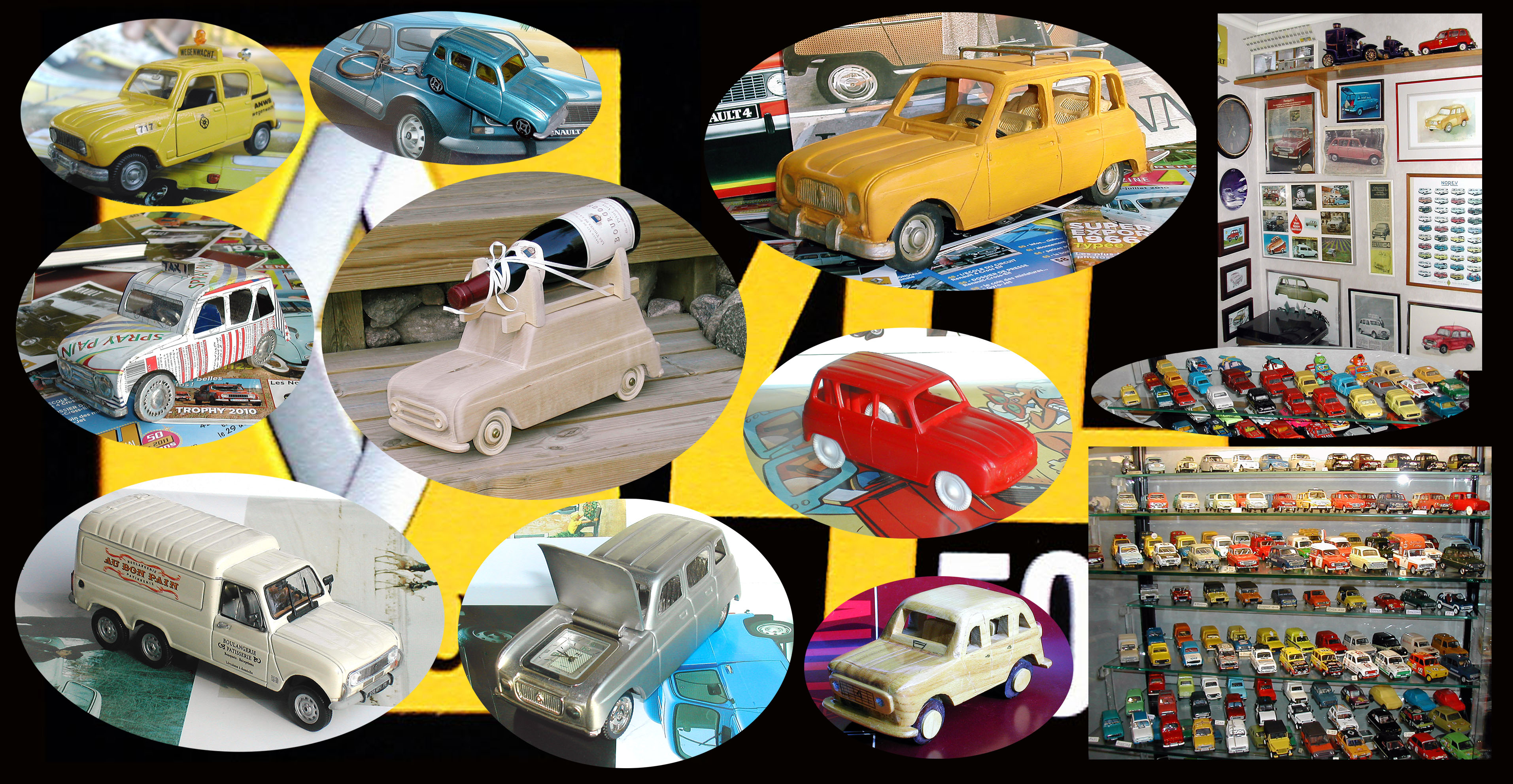 Alkuun pyysin Karia poimimaan vitriinistä 10 pienoismallia mittakaavassa 1:43 siten, että pinossa olisi autoja, joissa on keskenään joku selkeä ja mainittava ero, muista syistä merkittävä auto R4: n historiassa tai muu painava syy nostaa tippa pöydälle. Valintaa helpotti se asia, ettei mukaan huolittu aiemmin esiteltyjä malleja tai niiden variaatioita. Myös Heuliez-koripajan tuotanto jätettiin kokonaan pois tästä 10 mallin lajitelmasta, sillä niitäkin on niin paljon, että niistä voi laatia oman juttunsa. Näiden kymmenen kuvan lisäksi jokaisesta on erillisessä "laatikossa" pieni kuva, jossa on pyritty esittämään juuri sen mallin ratkaisevin yksityiskohta. Tämä 1:43 mittakaava ja sitä pienemmät autot ovat niitä, jotka löytyvät siististi vitriinistä, tyyppi- ja nimikyltein varustettuina. Ympäri huonetta, erilaisten hyllyjen päällä oli kuitenkin vielä runsaasti kummallisia, hienoja, rumia, kauniita, hauskoja ja harvinaisia malleja ihan muuten vaan koristeena, joten niistäkin piti tehdä oma kuvalaatikkonsa. Tosin siihen laatikkoon päätyi myös muutama pienemmän mittakaavan malli, kriteeriksi riitti, että malli on ainakin nykyään harvinainen.