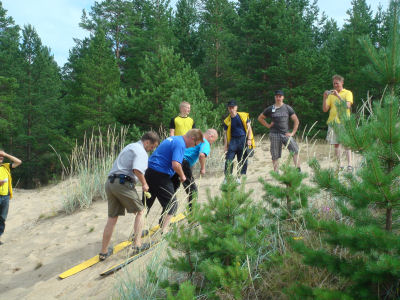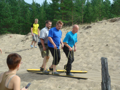 Kyseessä on todellakin aidot Renault-sukset! Mahtoikohan Markulla olla jonkinlainen ennakkoaavistus kilpatehtävistä, sillä yksi tehtävä oli hiihto hiekkadyyneillä ja pohjoisen tiimillä se meni oikein mallikkaasti. |