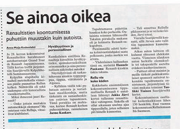Kerhon kesätapahtuma - Grand Tour de Renault - pidettiin tänä vuonna Saarijärven Summassaaressa. Tapahtuma veti puoleensa yli 120 kerholaista sekä päiväkävijät. Autojakin oli paikalla ihan mukavasti, tosin uudempi kalusto näytti jääneen mökkien pihoihin, eikä ollut suoraan kentällä ihaltavissa.
