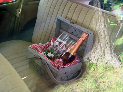 <-- R8 S:n esite oli vastaavan mallin ikkunassa. Hieno yksityiskohta! Alla kesän kauneimmaksi valittu tippa ja takapenkin piknik-korin kuvaan on tullut suorastaan taitellinen vaikutelma, kun viereisen puun heijastus näkyy selvästi lasissa. Luo mukavan retkitunnelman. |