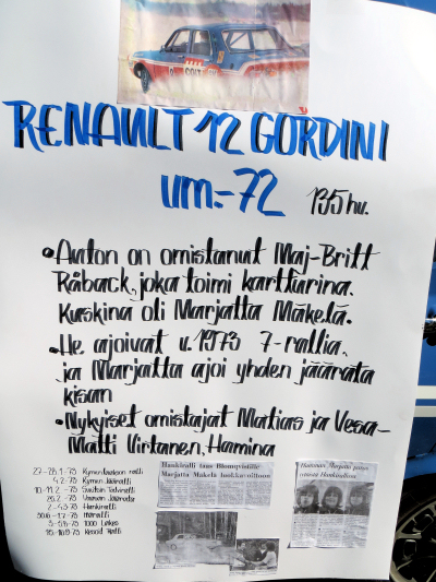 Tällä R12 Gordinilla on ajettua rallia ja on harvinaista, että paikalla on myös henkilö, joka on ollut itse mukana. Oli hienoa kuulla tarinoita tunnelmista ja tapahtumista.