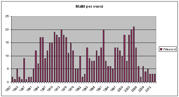 Tästä kuvasta näkyy, miten mallit jakautuvat eri vuosille (siltä osin kun vuosimalli on ilmoitettu). | |||||||||||||||||||||||||||||||||||||||||||||||||||||||||||||||||||||||||||||||||||||||||||||||||||||||||