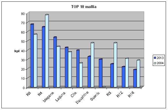 Kuvassa kerholaisten 10 suosituinta mallia. Vaaleampi palkki näyttää vertailun vuoksi, mikä oli tilanne 2004, kun vastaava tilasto on viimeksi julkaistu. Scenic on ilmaantunut listalle uutena mallina, sillä sitä ei edellisellä listalla ollut lainkaan. | ||||||||||||||||||||||||||||||||||||||||||||||||||||||||||||||||||||||||||||||||||||||||||||||||||||||||