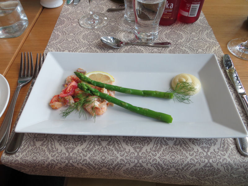 Alkuruokana suussa sulavaa parsaa seuranaan rapua, katkarapua ja simpukkaa sitruunaisen lisukkeen kera. Tätä oli ihan mukava kyydittää sopivan raikkaalla Rieslingillä helteisen päivän päätteeksi.