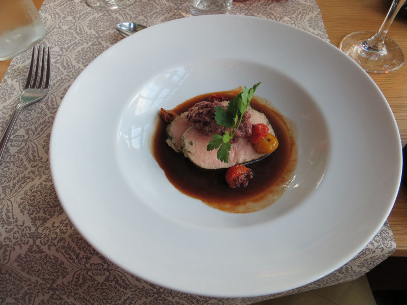 Pääruokana hienostuneen roseeksi paistettua vasikkaa punaviinisessä kastikkeessa ja päällä oliivimousse. Grillatut tomaatit täydensivät makuelämystä.