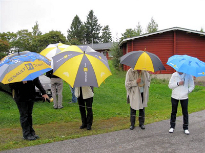 Ohessa kuva erilaisista Renault-sateenvarjoista. Onneksi missään vaiheessa ei kuitenkaan ollut varsinaista rankkasadetta vaan kuurot olivat lyhyitä.Kuva Kari Kitti.